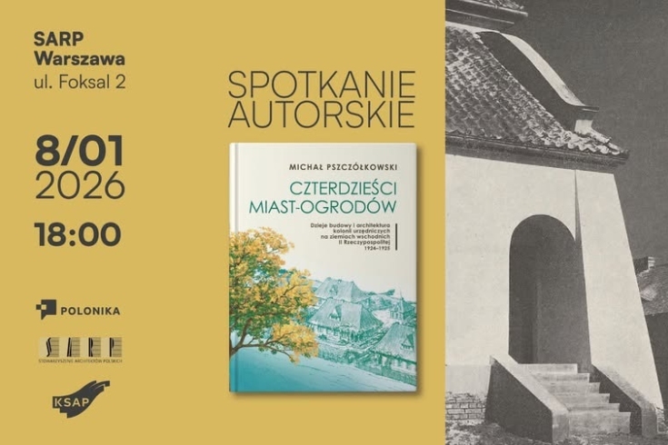 Zapraszamy na spotkanie, które odbędzie się w czwartek, 8 stycznia, o godz. 18:00 w siedzibie Stowarzyszenia Architektów Polskich (SARP) w Warszawie. Tego wieczoru porozmawiamy z dr. hab. Michałem Pszczółkowskim o jego publikacji pt. „Czterdzieści miast-ogrodów. Dzieje budowy i architektura kolonii urzędniczych na ziemiach wschodnich II Rzeczypospolitej. 1924–1925”.